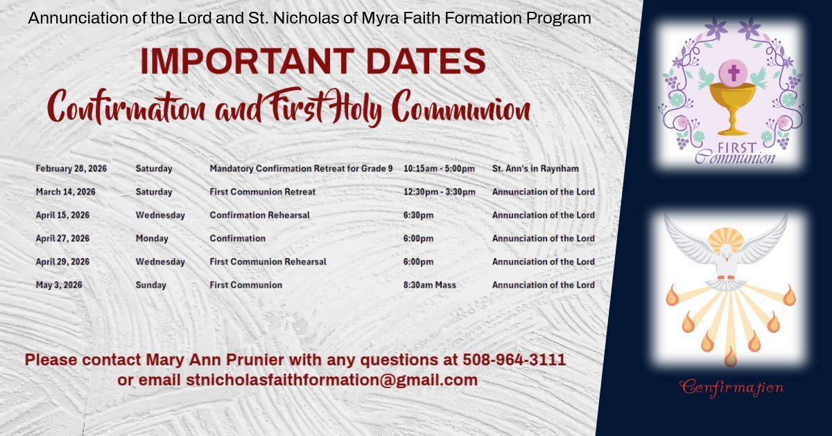 For any questions about registering your child, please reach out to Mary Ann Prunier, our Director of Faith Formation, at stnicholasfaithformation@gmail.com or call (508) 964-3411 .
